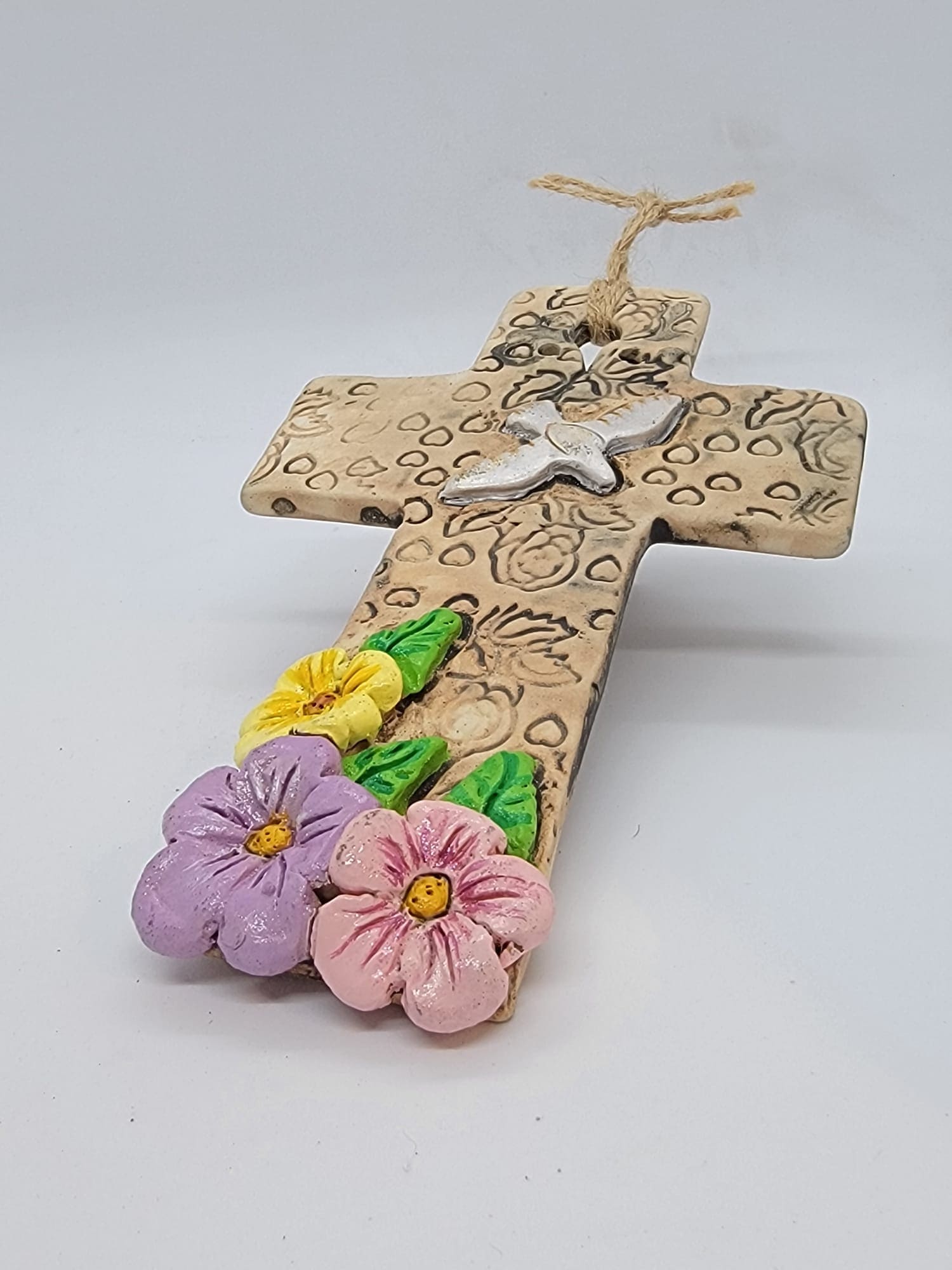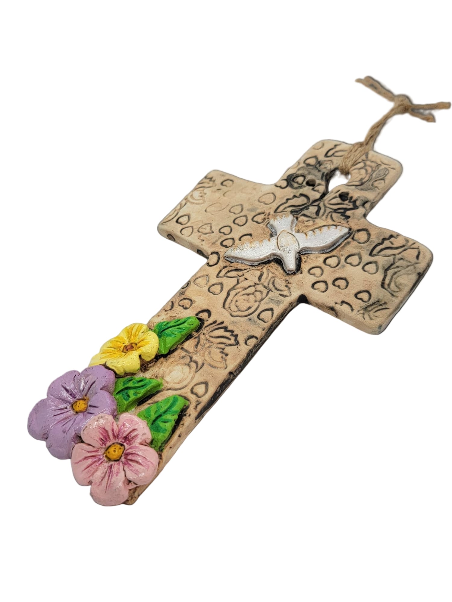 Handcrafted ceramic cross features a rustic texture that adds depth and character to any space. Decorated with delicate floral details, it combines artisan craftsmanship with natural beauty, making it a meaningful accent for home or sacred spaces.